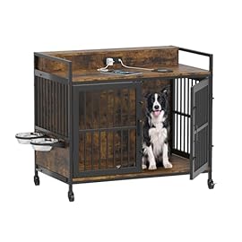 Piskyet Large Dog Crate Furniture, 39” Heavy Duty Dog Crate Table with Bulit 4 in 1 Charge Station and Storage&360°Rotatable Feeder Stainless Steel Bowls, Double Door Kennel with Wheels, Rustic Brown