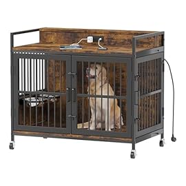 Piskyet Large Dog Crate Furniture,Heavy Duty Dog Crate Table with Charge Station and Storage&360°Rotatable Feeder and Stainless Steel Bowls