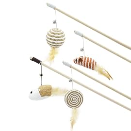 AdoPet 4PCS Cat Teaser Wand Toy Set – Wooden Handles with Sisal Rope Balls, Mouse & Feather Attachments, Interactive Play Wands with Bells for Indoor Cats