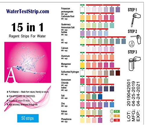 * WATER TEST STRIPS A – Water testing for 15 Parameters: Potassium Permanganate, Carbonate Root, Quaternary Ammonium Salt, Sulfate, VC, Calcium, Aluminum, Manganese, Sulfuretted Hydrogen, Ammonium, Iodine, Salt, Zinc, Kalium, Phosphorus.