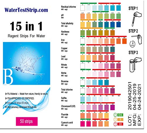 * WATER TEST STRIPS B – Water testing for 15 Parameters: Residual Chlorine,PH,Total, Alkalinity, Hardness, Iron, Copper, Lead, Nitrate, Nitrite, Bromine, Total Cholrine, Cyanuric, Chromium, Fluoride, Sulfilte.