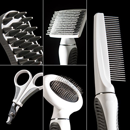 The set contains every tool for daily grooming: nylon slicker brush, metal slicker brush, rubber palm brush, fine grooming comb and curved nail clipper