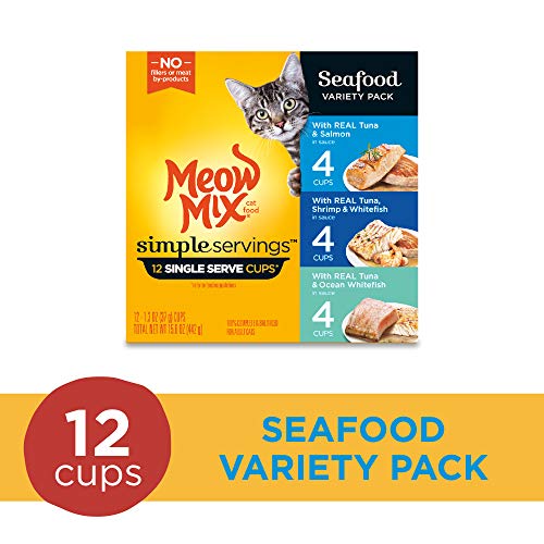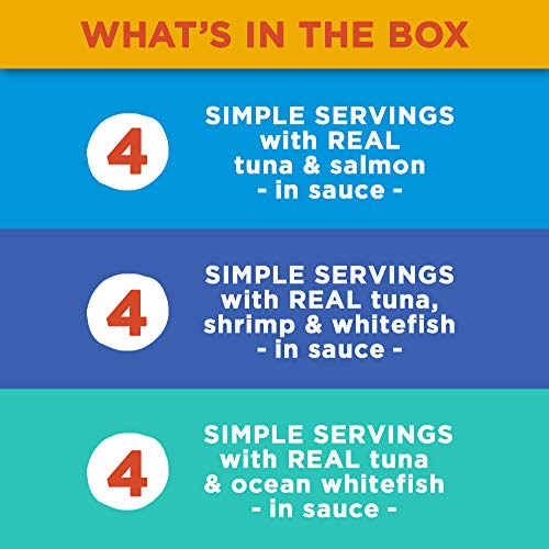 Variety Pack includes: Simple Servings with REAL tuna and ocean whitefish in a savory sauce, Simple Servings with REAL tuna and salmon in a savory sauce, and Simple Servings with REAL tuna, shrimp, and whitefish in a savory sauce