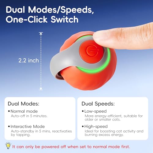 Two-Speeds and Two-Modes for Endless Stimulation – Toggle between low and high-speed settings with just a short press on the button. Whether your adult cat or kitten prefers a slow roll or speedy action, this toy adapts to their activity level for non-stop exercise and enrichment. Long press the button to toggle between Normal and Interactive modes, catering to your cat’s needs.