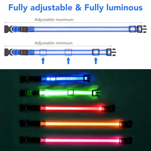 【TPU Material & Adjustable】 — Made of High qualityTPU and Nylon material, it can make your pet more comfortable.Each LED dog collar can be adjusted by buckle. It also has a heavy-duty D-ring that can be attached with any dog leash.